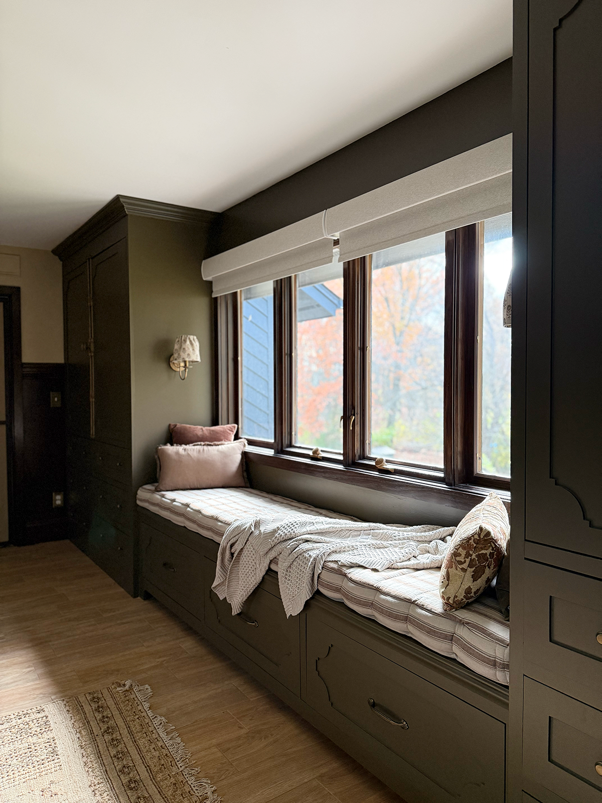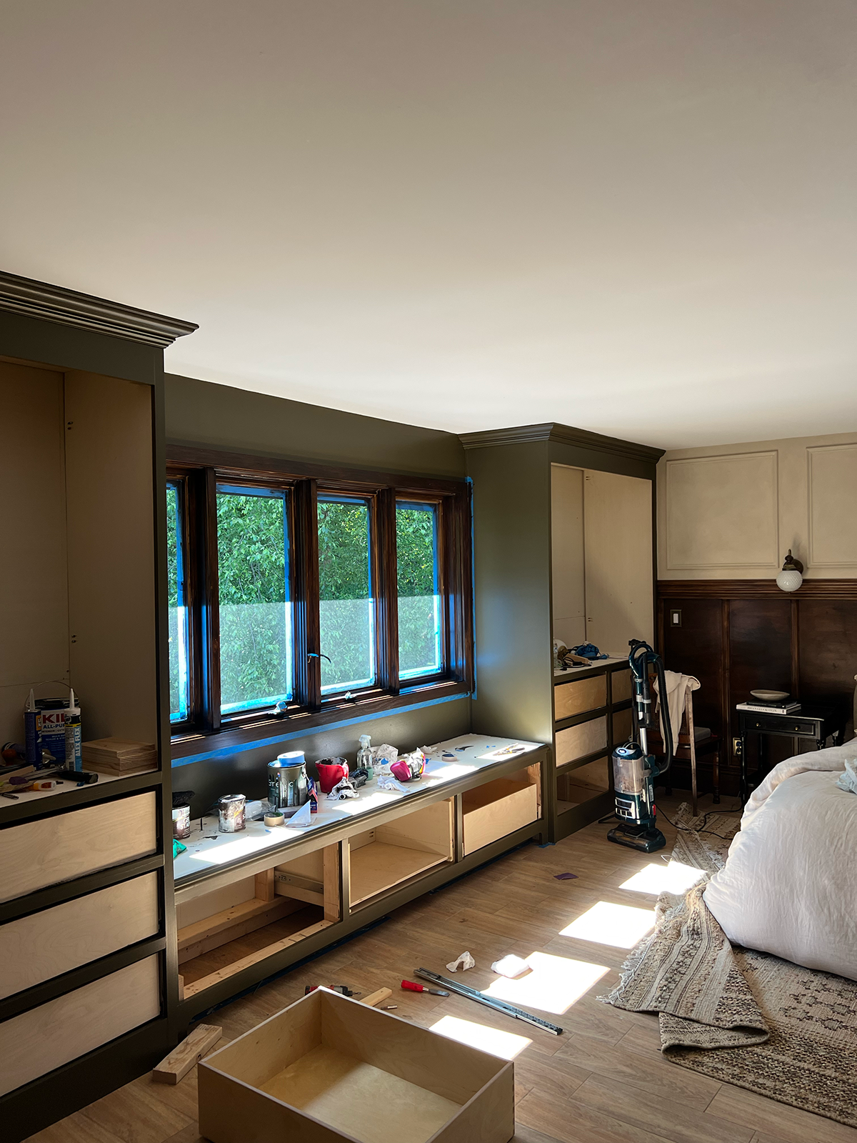 The addition of built-ins and a window bench has made this space more functional and aesthetic. The wardrobes provide ample storage, replacing the old dressers and adding a touch of elegance.