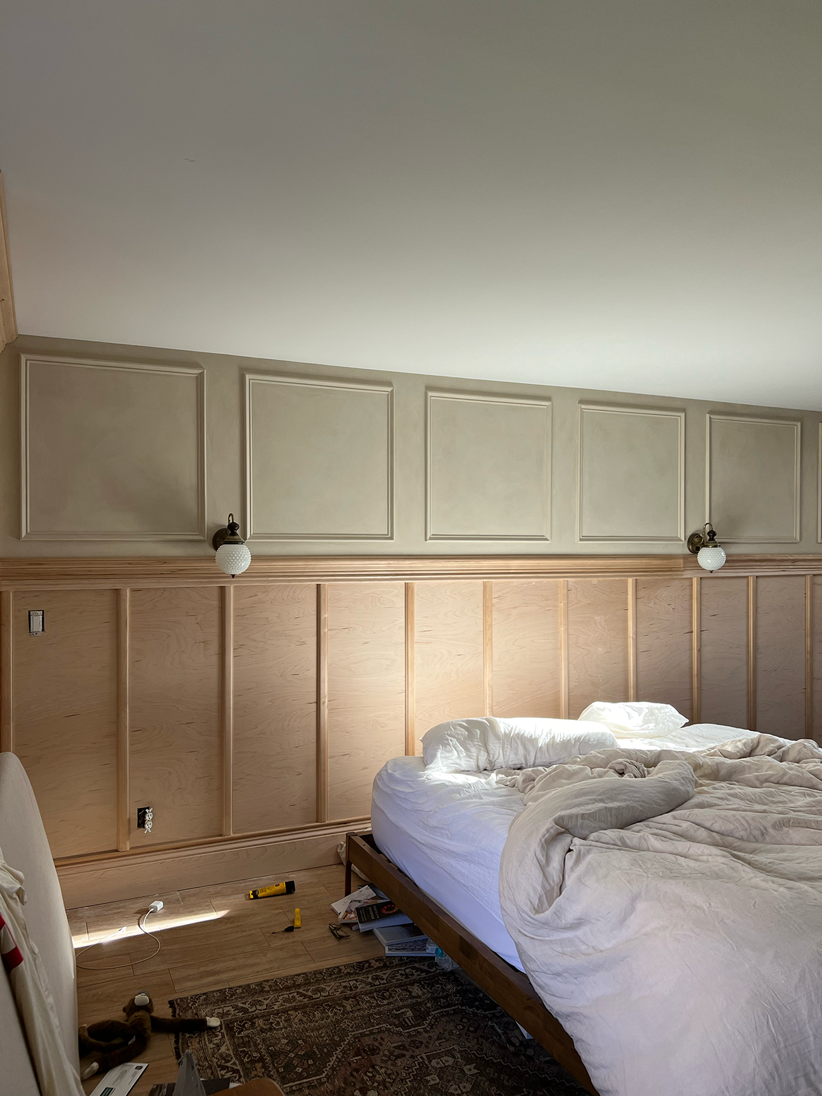The top half of the walls was treated with a limewash from Meoded Paint in the color villa, adding more character and depth to the plain walls.