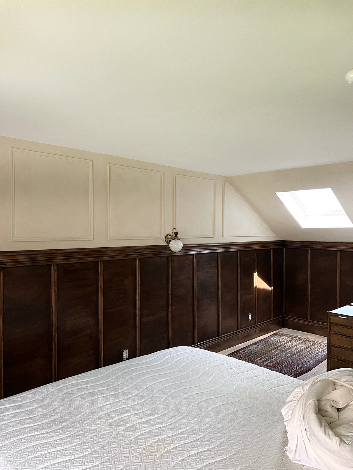 After exploring ideas on Pinterest, I was inspired by dark wood paneled walls that exude character and an old-world charm. I was determined to achieve this look, so we embarked on a DIY project to create our own version using different pieces of wood.