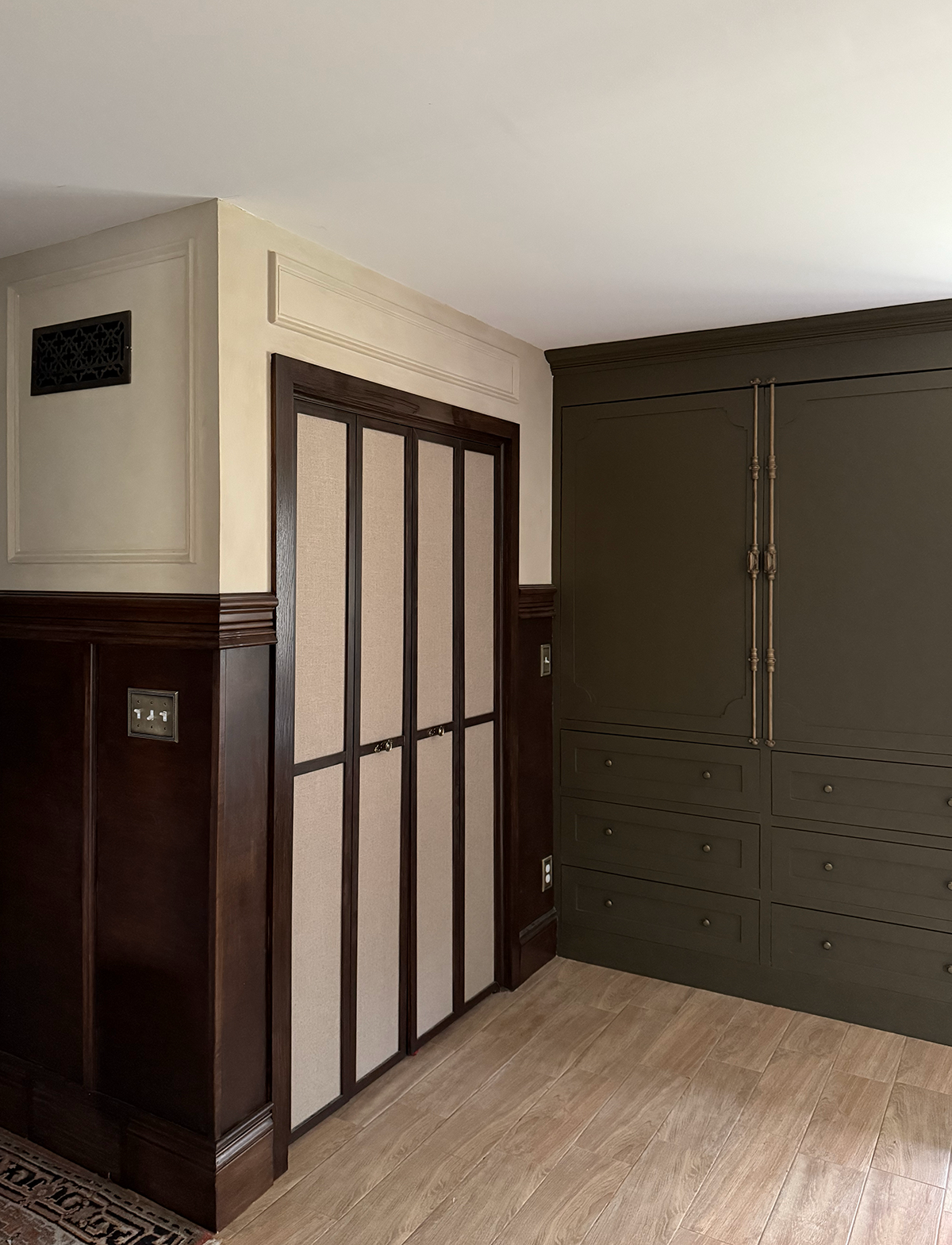 The closet received a simple yet impactful makeover with fabric and wood framing, blending seamlessly with the room’s aesthetic.