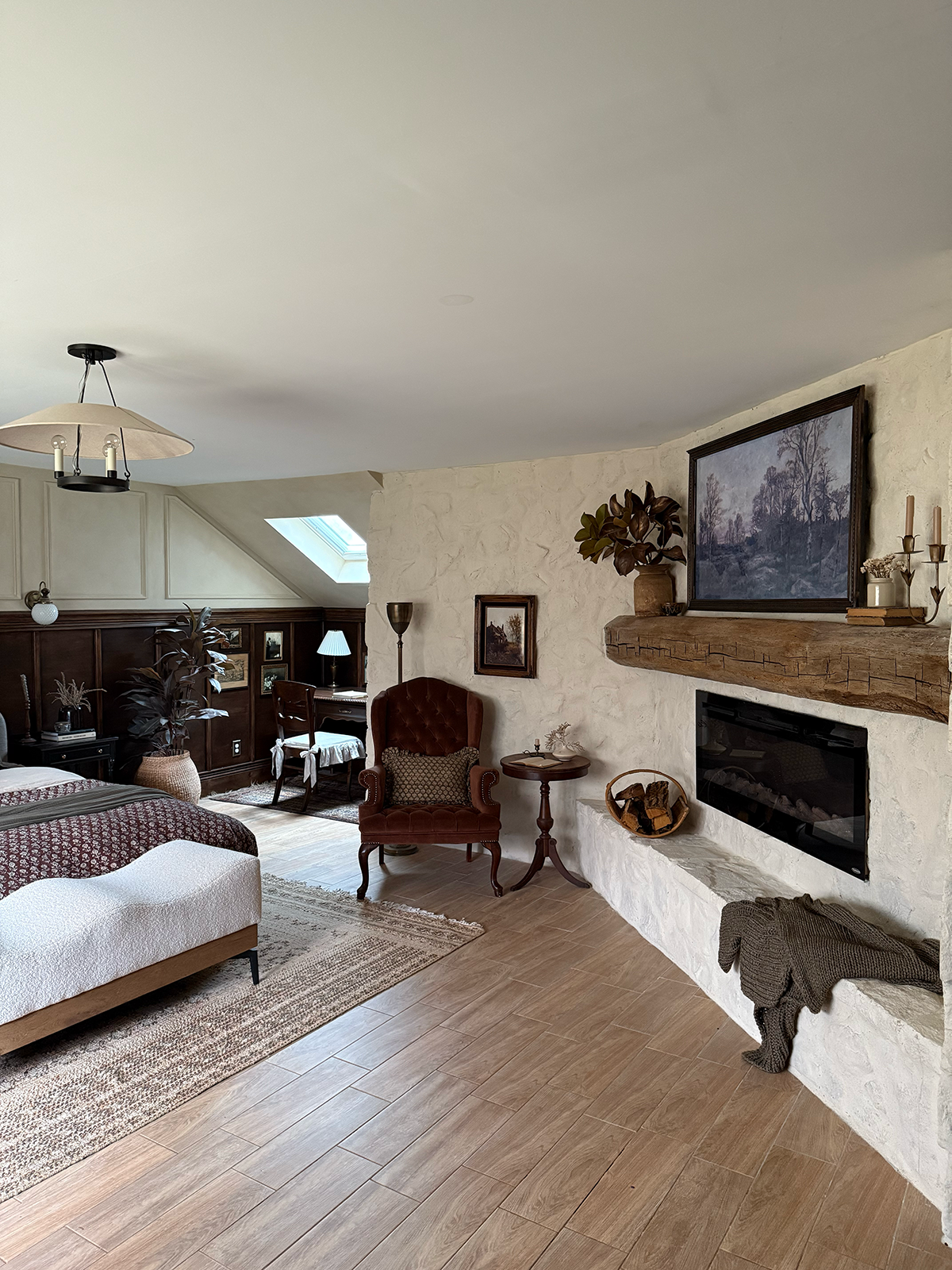 Our bedroom fireplace often fools people into thinking it’s in the living room. The reclaimed wood framing the doorway leads to the master bathroom, adding to the European cottage vibe.