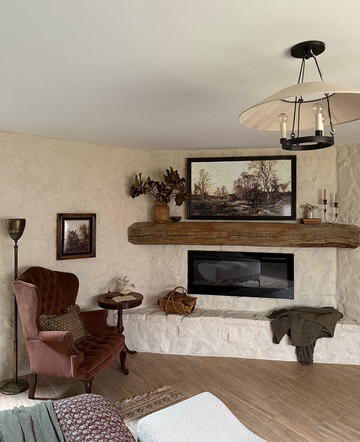 Walking into the room reveals the stone fireplace that set the tone for the refresh. The European cottage vibe inspired the subsequent changes we made in the space.