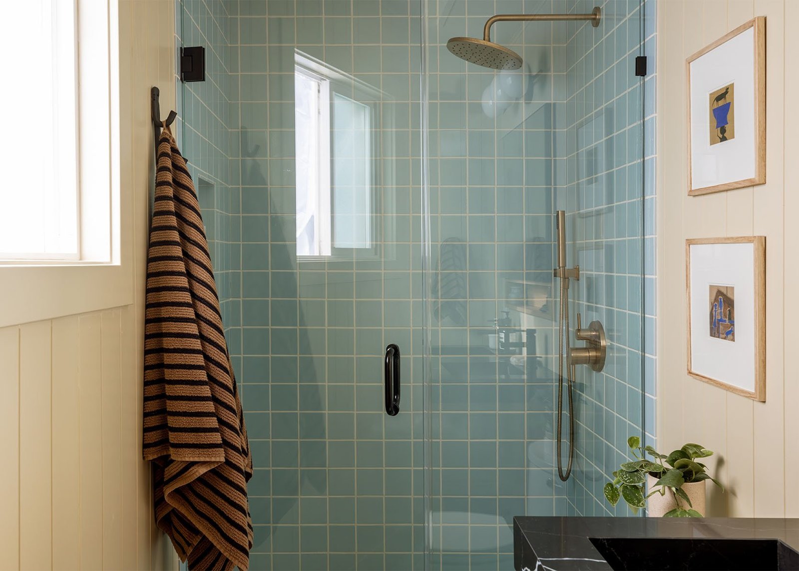 Once the demo and plumbing were complete, we moved on to tiling. Fireclay generously provided us with beautiful blue square tiles that we used on the floor and shower walls. Opting for white grout made the tiles stand out and added a fresh, clean look to the space.