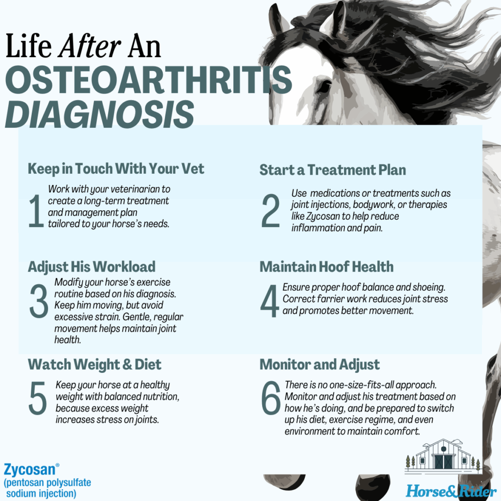 Receiving an osteoarthritis diagnosis for your horse can be daunting. However, it doesn’t signify the end of his best days, nor does it require him to be confined to a stall for the rest of his life. While the condition cannot be cured, there are treatments available, and many horses continue to thrive post-diagnosis. Your horse’s routine, diet, and treatment plan may need adjustments based on the severity of the condition, but with proper management, life can go on after the diagnosis.
