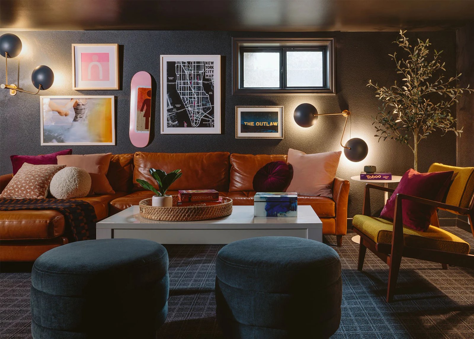 - Add a round ottoman to visually enlarge the coffee table.
